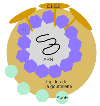 L’ARN du VHC se trouve dans une capside protéique, elle-même entourée de lipides issus des gouttelettes lipidiques cellulaires. Le VHC est un virus enveloppé, qui est en fait inclus dans une gouttelette lipidique. Sa couche externe est constituée d’un manteau de glycoprotéines virales (E1 et E2) et d’apolipoprotéines d’origines cellulaires (principalement ApoE).