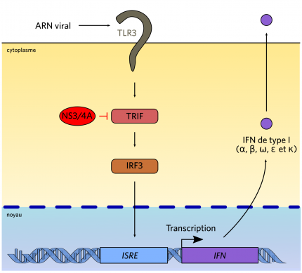 La protéine virale serait capable de cliver TRIF, protéine adaptatrice du TLR3.