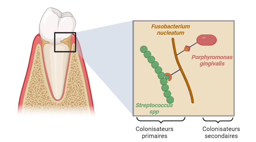 Fusobacterium nucleatum adhère d'abord aux colonisateurs primaires de la surface dentaire tels que Streptococcus spp. Une fois fixée au biofilm en développement, F. nucleatum s'agrège aux colonisateurs secondaires tels que P. gingivalis. Schéma réalisé avec Biorender.