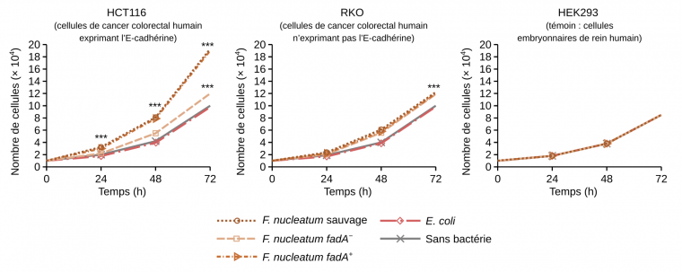 La souche mutante dépourvue de fadA (fadA−), n'a que faiblement stimulé la croissance des cellules cancéreuses HCT116 en comparaison à la souche sauvage et à la souche mutante complémentée en fadA.