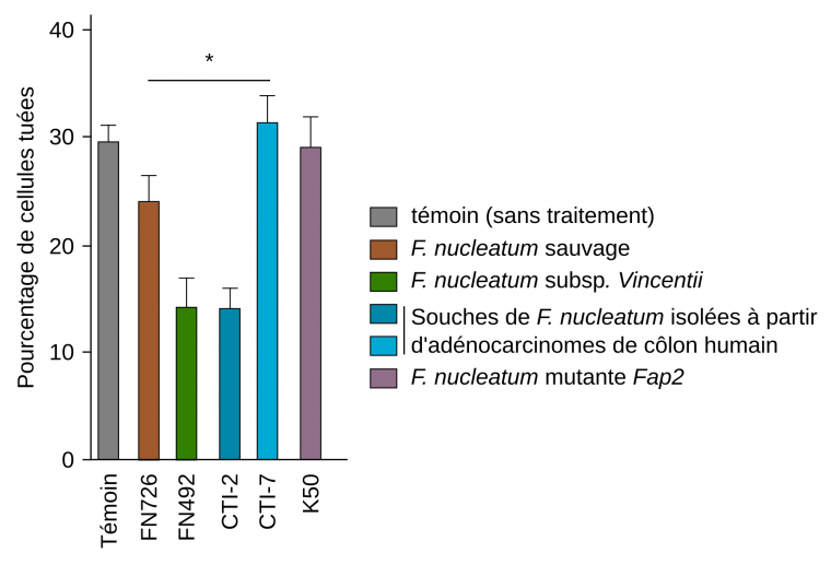 Des cellules cancéreuses issues d’un mélanome humain ont été incubées en absence de bactéries (témoin), en présence de la souche sauvage de Fusobacterium nucleatum Fn (FN726), de la sous-espèce Fusobacterium nucleatum subsp. Vincentii (FN492), de souches de F. nucleatum isolées à partir d'adénocarcinomes du côlon humain (CTI-2 et CTI-7) ou encore d’une souche dépourvue de protéine Fap2 fonctionnelle (K50). Le pourcentage de cellules cancéreuses tuées est ensuite mesuré. Le rapport cellules effectrices (LT) : cellules cibles (cellules cancéreuses) était de 5:1. Le rapport bactéries : cellules cancéreuses était de 600:1. *p < 0,05.
