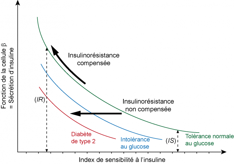 L’index de sensibilité à l’insuline mesure la capacité des cellules à répondre à l’action de l’insuline, et donc à faire baisser la glycémie. Une amélioration ou une détérioration de l’action de l’insuline sur ses cellules cibles (foie, tissu adipeux, muscles squelettiques) est compensée par une réduction ou une augmentation de la sécrétion par les cellules β des îlots de Langerhans du pancréas. On parle d’insulinorésistance compensée lorsque le pancréas répond à l’insulinorésistance en produisant davantage d’insuline, ce qui permet de maintenir une glycémie normale. L’insulinorésistance est dite non compensée lorsque le pancréas ne parvient plus à produire suffisamment d’insuline pour compenser l’insulinorésistance. Par conséquent, la glycémie augmente, menant à une intolérance au glucose puis à un diabète de type 2.