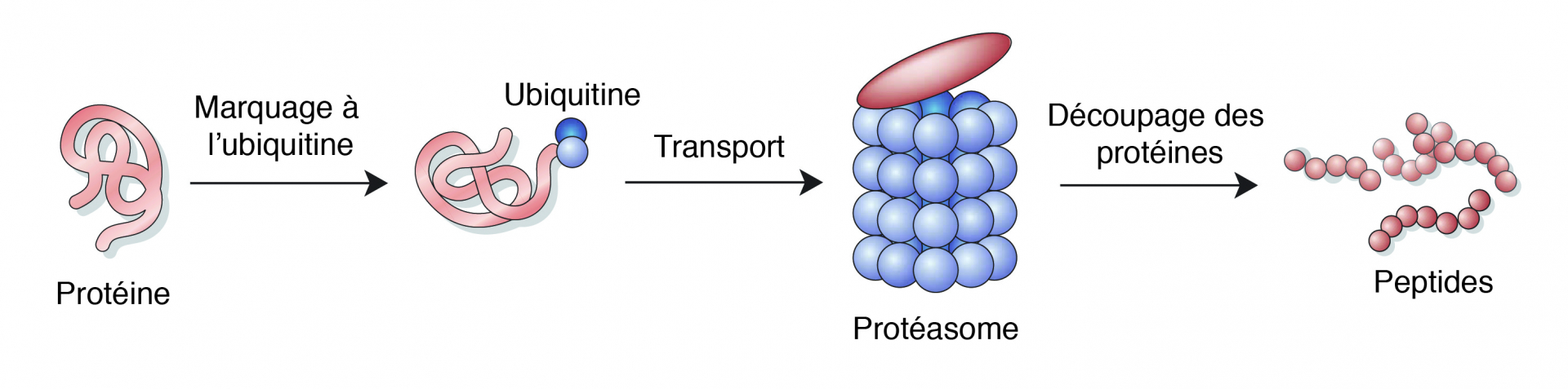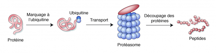Une des voies de dégradation des protéines dans une cellule est le système ubiquitine-protéasome. Les protéines qui doivent être dégradées sont marquées par une protéine, l’ubiquitine, qui permet de les diriger vers le protéasome. Ce dernier est un complexe enzymatique qui va permettre de couper les protéines en peptides de 7 à 9 acides aminés qui seront ensuite hydrolysés puis recyclés hors du protéasome [13].