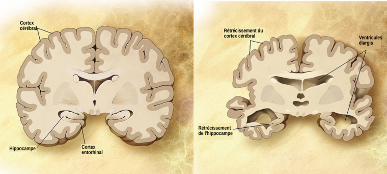 Illustration de la neurodégénérescence dans une maladie neurodégénérative, la maladie d’Alzheimer (cerveau de droite). La perte des neurones conduit à un rétrécissement du cortex cérébral et de l’hippocampe ainsi qu’un élargissement des ventricules latéraux, provoquant les différents symptômes.