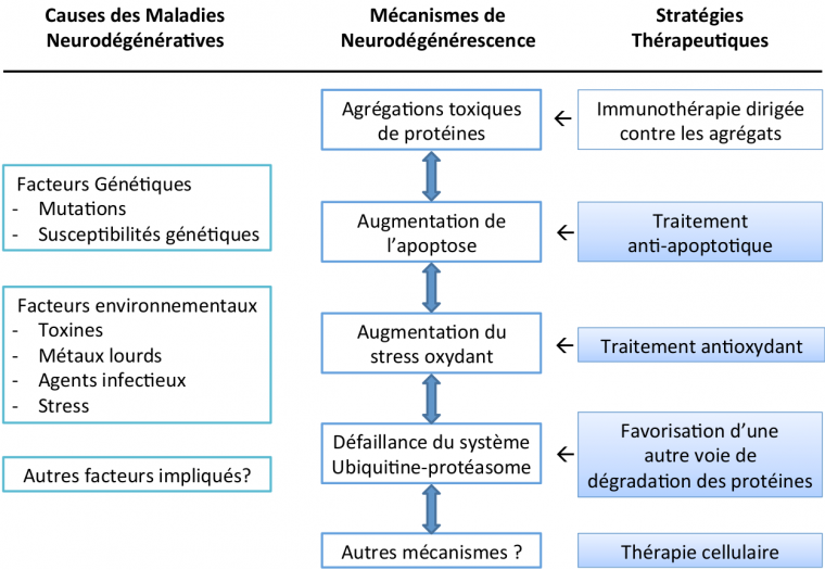 Si les causes de l’émergence des MND sont encore peu connues, les mécanismes de mort cellulaire ont été largement étudiés aussi bien chez l’homme que dans des modèles animaux de ces pathologies. Cependant, beaucoup de mécanismes ayant été proposés restent encore largement débattus au sein de la communauté scientifique. Cela est notamment dû à l’incroyable diversité des types de neurones affectés pouvant différer en termes de morphologie, de localisation, de rôle, ou de composition neurochimique ; mais aussi de la complexité de l’environnement dans lesquels ils se trouvent, le système nerveux.