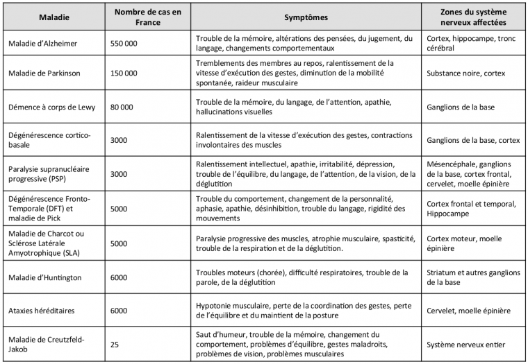Cette liste montre l’hétérogénéité des symptômes et des zones du système nerveux affectées. Dans certains cas, les symptômes et les zones affectées se croisent, permettant de regrouper les maladies en différentes classes comme les démences, les maladies parkinsoniennes, les maladies motrices, etc.
