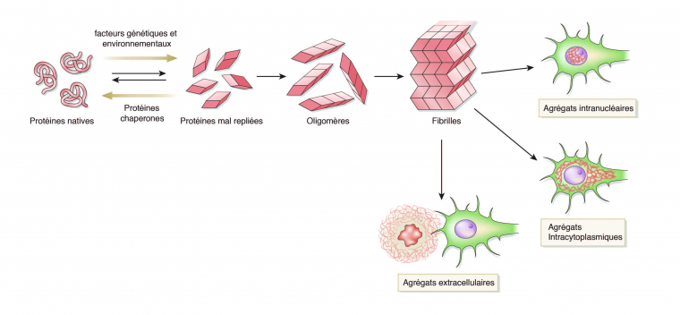 Le génome humain code environ 30 000 protéines qui ont chacune une forme et une ou plusieurs fonctions biologiques leur étant propres. Après leur synthèse, les protéines acquièrent une forme native spécifique en trois dimensions qui leur permet d’exercer leurs actions biologiques. Il arrive que sous certaines contraintes, des protéines présentent une forme anormale à cause d’un mauvais repliement. Dans des conditions physiologiques, ces protéines mal repliées sont soit corrigées par des protéines chaperonnes soit dégradées et éliminées par le système ubiquitine-protéasome ou par le système phagosome-lysosome (autophagie). Des facteurs tels que l’âge, les mutations génétiques, des changements de l’environnement intracellulaire, les variations de pH, le stress oxydant, ou les métaux lourds, peuvent conduire à l’augmentation de concentration de protéines mal repliées. Ces protéines normalement solubles vont alors s’agréger entre elles pour constituer des oligomères qui vont eux-mêmes s’agréger formant ainsi des fibrilles qui sont insolubles. Ces dernières vont alors former des inclusions intranucléaires ou intracytoplasmiques et peuvent également constituer des agrégats extracellulaires qu’on appelle alors plaques séniles [8].