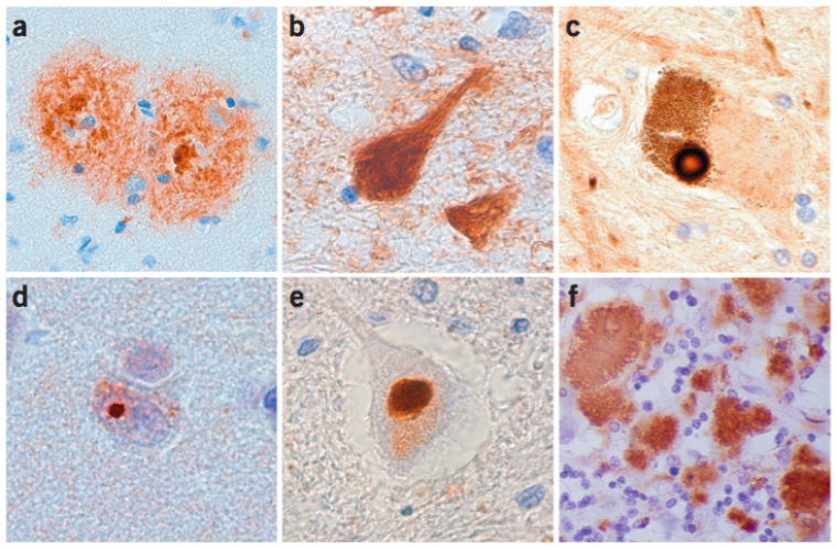 (a) Plaque séniles dans le cortex d’un patient Alzheimer. (b) Agrégats de protéines Tau dans l’hippocampe d’un patient atteint de dégénérescence fronto-temporale. (c) Corps de Lewy dans la substance noire d’un patient parkinsonien. (d) Inclusion intranucléaire de polyglutamine dans le cortex d’un patient atteint de la chorée de Huntington. (e) Inclusion d’ubiquitine dans la moelle épinière d’un patient atteint de la sclérose latérale amyotrophique. (f) Protéine PrP dans le cervelet d’un patient atteint de la maladie de Creutzfeld-Jakob.