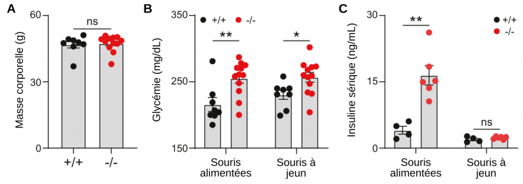 Afin de caractériser ce microARN in vivo, les chercheurs ont généré une lignée de souris, dans laquelle le gène miR-6236 a été inactivé. Ils les ont comparées avec des souris témoins. Les deux lignées étaient soumises à une alimentation induisant l’obésité. Ils ont ainsi montré que si le poids des souris était identique chez les deux groupes, celles n’exprimant pas miR-6236 présentaient une glycémie plus élevée aussi bien en période de jeun (après 5h de jeun) que juste après un repas (Figure 1). De plus, leur taux d’insuline dans le sérum après une prise alimentaire était élevé et elles présentaient une moins bonne tolérance au glucose à jeun que les souris sauvages. Ces résultats suggèrent que miR-6236 permet de favoriser la sensibilité à l’insuline et l’homéostasie du glucose chez des souris rendues obèses par l’alimentation.