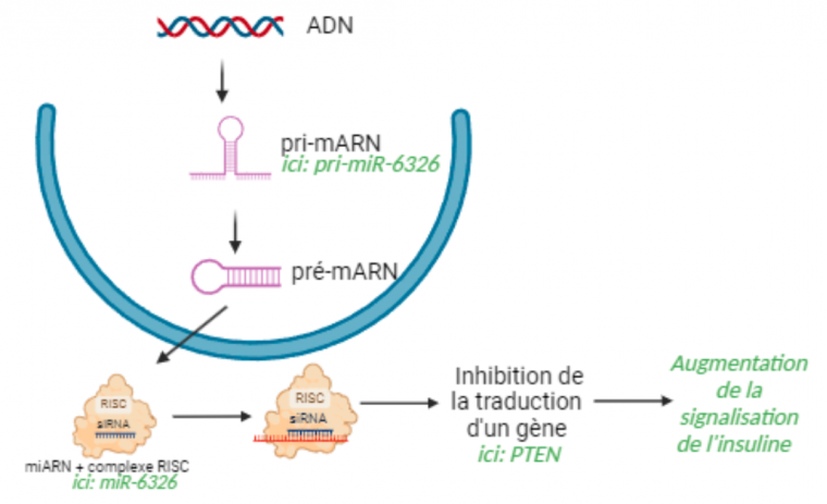 Des expériences complémentaires ont mis en lumière le mécanisme d’action de miR-6236. Il empêcherait la traduction de l'ARNm du gène Pten en se liant à son extrémité 3’. La protéine PTEN est connue pour réguler négativement la signalisation à l’insuline. Ce faisant, l'inhibition de son par le microARN miR-6236 permettrait une augmentation de la sensibilité à l’insuline et par conséquent une meilleure régulation de la glycémie (Figure 2).
