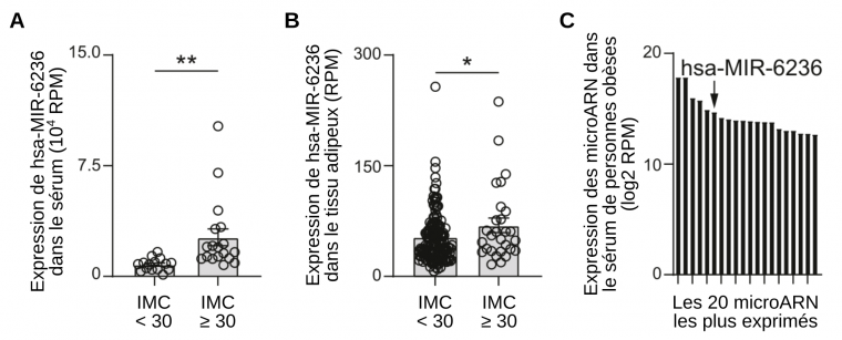 Si ces résultats ont été obtenus chez des rongeurs, il existe cependant bien un microARN homologue chez l’humain : hsa-MIR-6236. L’expression de ce microARN est plus élevée dans le tissu adipeux et dans le sérum de sujets obèses que dans ceux de personnes de corpulence normale (Figure 3). Chez les personnes obèses, hsa-MIR-6236 est même le sixième microARN le plus abondant du sérum. De même que chez la souris, hsa-MIR-6236 inhibe la traduction de l’ARNm codant PTEN en se liant à son extrémité 3’. Par ailleurs, une transfection d’adipocytes humains avec hsa-MIR-6236 diminue leur taux de protéine PTEN et augmente l’absorption de glucose stimulée par l’insuline. Ainsi, ces travaux montrent que le microARN humain partage les caractéristiques moléculaires et les fonctions de son homologue murin, ouvrant des perspectives thérapeutiques intéressantes.
