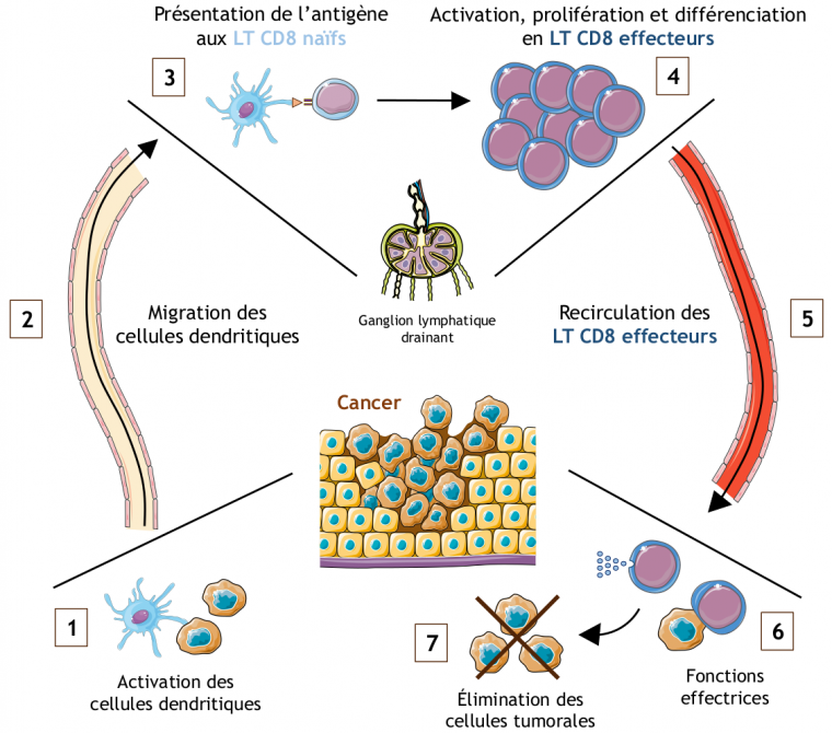 Au niveau de la tumeur, les cellules dendritiques reconnaissent les antigènes tumoraux exogènes (libérés notamment après apoptose des cellules tumorales), les internalisent et les présentent à leur surface sur des molécules de CMH (1). Ces cellules dendritiques activées migrent alors par les vaisseaux lymphatiques jusqu’au ganglion lymphatique drainant (2). À cet endroit, les cellules dendritiques présentent les antigènes tumoraux aux lymphocytes T CD8 naïfs (3) qui sont activés, prolifèrent et se différencient en lymphocytes T CD8 effecteurs (lymphocytes T cytotoxiques) (4). Ces cellules migrent alors via la circulation sanguine jusqu’au site de la tumeur (5) où, grâce à leurs fonctions effectrices (lyse des cellules cibles et sécrétion de cytokines (6)), ils éliminent les cellules tumorales (7).