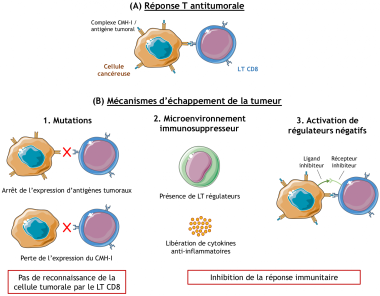 Ainsi, une réponse immunitaire est mise en place en cas de tumeur, permettant initialement de contrôler la croissance tumorale : on parle « d’immunosurveillance ». Toutefois, des cellules tumorales résistantes peuvent émerger suite à l’apparition de mutations avantageuses. La tumeur peut alors se développer de façon incontrôlée, grâce à la mise en place de nombreux mécanismes d’échappement au système immunitaire.