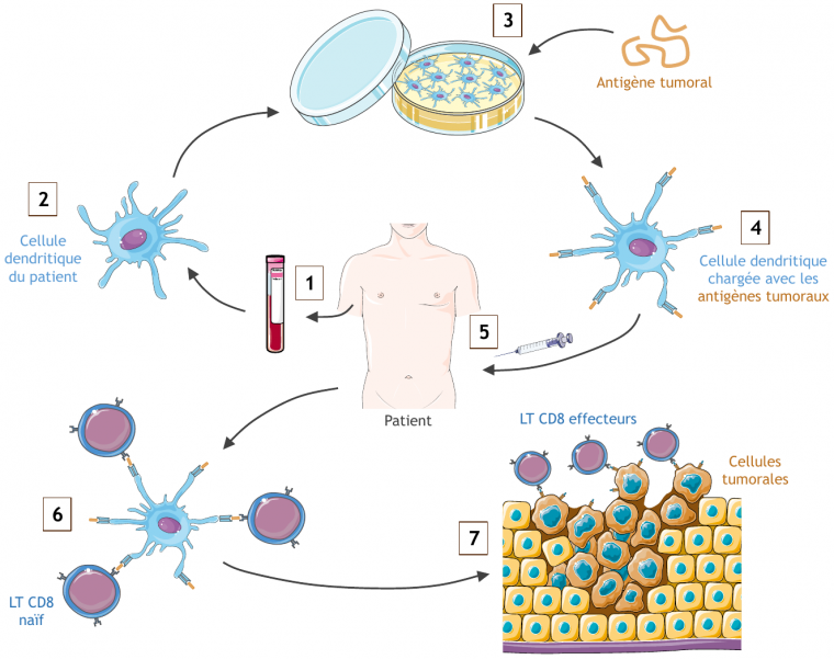 Un échantillon de sang est prélevé au patient (1) puis les cellules dendritiques sont isolées (2) et cultivées in vitro avec des antigènes spécifiques des cellules cancéreuses du patient (3). Cela induit l’activation des cellules dendritiques, qui expriment à leur surface les antigènes tumoraux (4). Une fois réinjectées chez le patient (5), les cellules dendritiques présentent les antigènes aux lymphocytes T CD8 naïfs dans les ganglions lymphatiques (6). Ces derniers sont alors activés, prolifèrent et se différencient en lymphocytes T CD8 effecteurs, qui migrent jusqu’au site de la tumeur pour y éliminer les cellules tumorales présentant les antigènes ciblés (7).