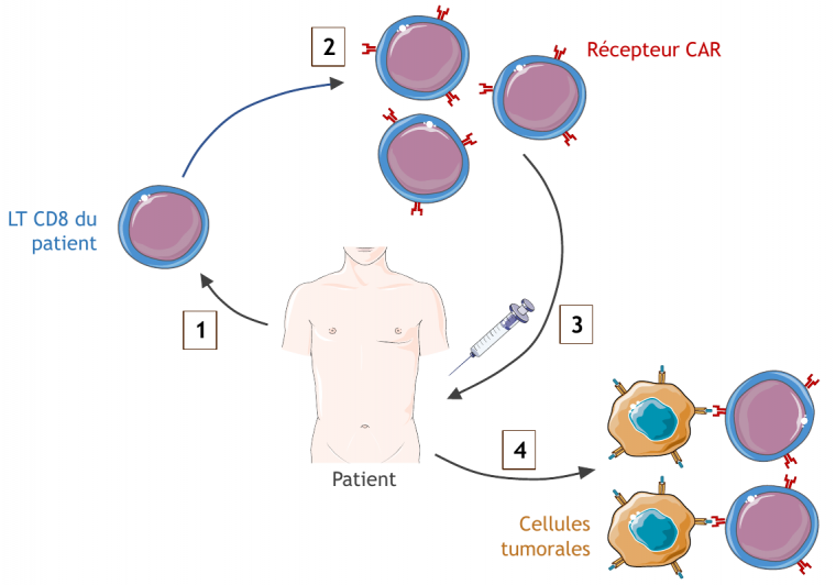 Pour fabriquer les cellules CAR-T, des lymphocytes T sont prélevés chez le patient (1). Ces cellules sont modifiées génétiquement in vitro pour leur ajouter le gène codant le récepteur chimérique d’intérêt, puis cultivées afin de permettre leur multiplication (2). Les cellules CAR-T ainsi fabriquées sont réinjectées chez le patient (3), où elles vont pouvoir reconnaître et éliminer les cellules tumorales (4).