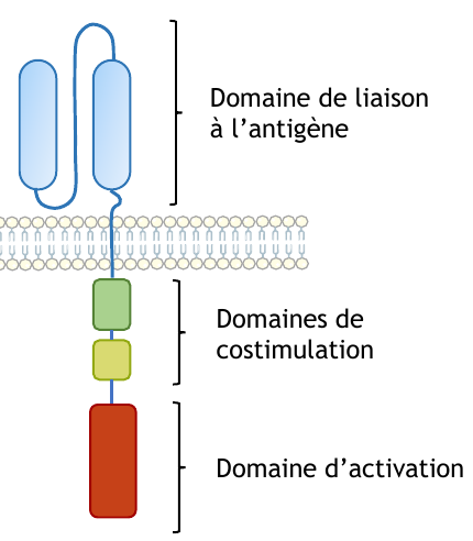 Les récepteurs CAR (Chimeric Antigenic Receptors) sont classiquement constitués de trois domaines : un domaine de liaison à l’antigène, un ou deux domaine(s) de costimulation, et un domaine d’activation.