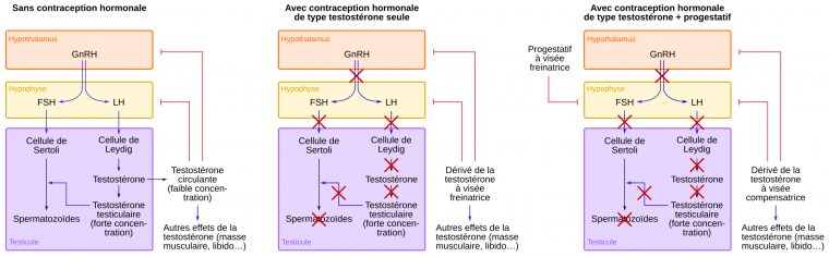 Au milieu. Un premier type de contraception hormonale utilise un dérivé de la testostérone seul. Celui-ci supprime la fonction de l’axe hypothalamo-hypophysaire, ce qui bloque la spermatogenèse mais également la production de testostérone testiculaire. Cependant le dérivé de la testostérone permet de compenser l’absence de production de testostérone endogène pour les effets périphériques de cette hormone.