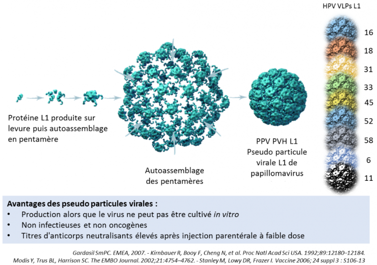 Les pseudo-particules virales ont une conformation quasi-identique à celle du virus sauvage, mais sont totalement dépourvues de matériel génétique. Elles sont obtenues par l’assemblage spontané de 72 copies de la protéine principale de la capside, la protéine L1, dans le milieu de culture. Celle-ci est exprimée par un système cellulaire (Saccharomyces cerevisiae ou cellules d’insectes infectées par un baculovirus) dont le génome a été recombiné avec le gène codant la protéine. Les pseudo-particules virales ne sont donc, par construction, ni infectieuses ni oncogènes (14).