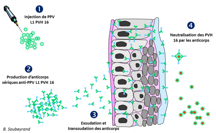 Après injection intramusculaire, les pseudo-particules virales L1 induisent des titres d’anticorps sériques neutralisants très élevés, beaucoup plus qu’après infection naturelle (x 100 à 1 000). Chez les vaccinés, les anticorps sont le principal, sinon le seul, mécanisme de protection contre les PVH. Au niveau de l’appareil génital féminin, ces anticorps (IgG) diffusent à partir du plasma dans le mucus cervico-vaginal selon deux mécanismes : une exsudation directe passive (les anticorps passent entre les cellules de l’épithélium) et une transsudation active (les anticorps transitent à travers les cellules) conduisant à des titres d’IgG environ dix fois plus élevés localement que ceux présents dans le plasma. Lors d’une exposition aux papillomavirus humains, la présence des anticorps spécifiques les empêche d’infecter leurs cellules cibles : les cellules basales de l’épithélium muqueux (16) (Figure 3).