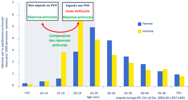 Les études d’efficacité clinique (protection contre la maladie) ne sont pas possibles pour les maladies sexuellement transmissibles chez les préadolescents alors qu’ils sont la cible de la vaccination. L’efficacité du vaccin est inférée chez les adolescents si la réponse anticorps anti-PVH induite par la vaccination est non inférieure à celle induite chez des femmes pour lesquelles la protection clinique par la vaccination a été démontrée.