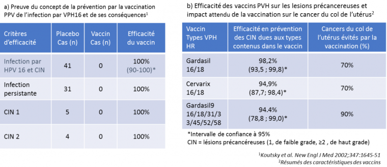 En effet, le fait que le cancer du col de l’utérus survienne 20 à 30 ans après l’infection et les raisons éthiques liées à la pratique du dépistage et du traitement des lésions précancéreuses imposent d’utiliser comme critère d’efficacité dans les essais cliniques la prévention des lésions précancéreuses (CIN) et non celle du cancer du col à proprement parler. La démonstration stricto sensu de la prévention de ce cancer par la vaccination ne peut donc être apportée que par des études conduites en population, une fois le vaccin enregistré (c’est-à-dire ayant obtenu une autorisation de mise sur le marché) et utilisé.