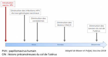 Lors de la mise en place des programmes de vaccination des PVH en prévention du cancer du col de l’utérus, le recul sur la durée d’efficacité était de l’ordre de 4-5 ans, sans savoir si les adolescentes vaccinées seraient protégées 10, 20 ou 40 ans plus tard, si des injections de rappels seraient nécessaires, si la vaccination préviendrait la survenue de cancer du col stricto sensu ou dans quelle mesure les vaccinés pourraient indirectement protéger les non vaccinés.