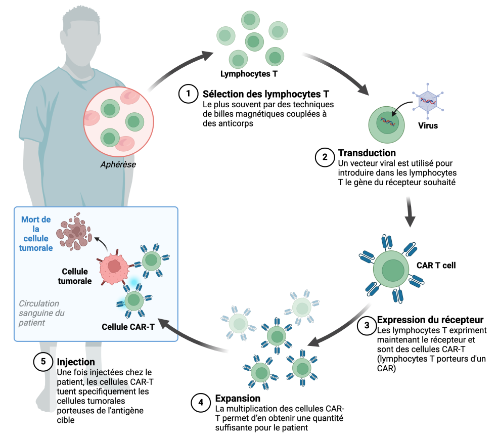 Les cellules CAR-T (pour chimeric antigenic receptor, ou « récepteur antigénique chimérique » en français) sont produites à partir de lymphocytes T issus du patient lui-même ou d’un donneur sain. Ces cellules sont ensuite modifiées génétiquement in vitro pour exprimer un récepteur spécifique des cellules tumorales du patient et ainsi les éliminer. En effet, un des rôles importants des lymphocytes T est leur capacité à reconnaître et détruire les agents pathogènes, qu'il s'agisse de bactéries ou de cellules cancéreuses. Cependant, lors du développement de certains cancers, cette capacité de défense immunitaire peut être inactivée par différents mécanismes.