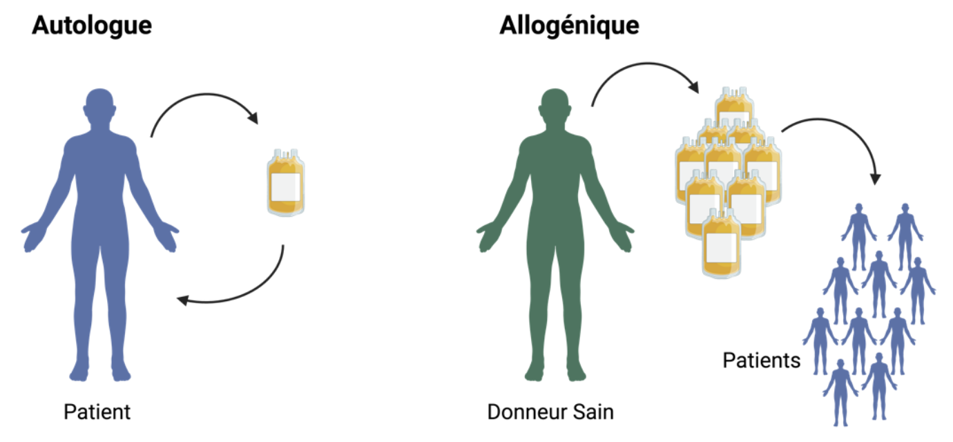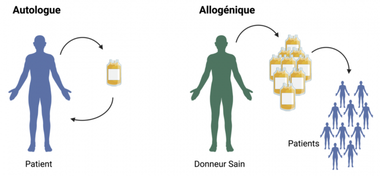 Lorsqu’ils mettent en jeu des cellules ou des tissus, les médicaments de thérapie innovante peuvent être autologues si les cellules ou tissus utilisés proviennent du patient lui-même ou allogéniques sinon (Figure 1). Les traitements allogéniques présentent le problème de la compatibilité immunologique entre le donneur et le receveur, qui peut être à l’origine de complications comme le rejet de greffe. Ce risque peut toutefois être diminué par un traitement immunosuppresseur. L’avantage de la thérapie allogénique est que dans certains cas, un même donneur peut être la source de cellules ou de tissus pour plusieurs patients.