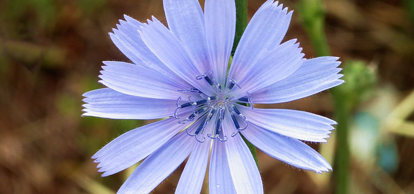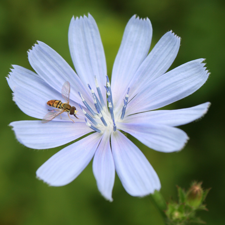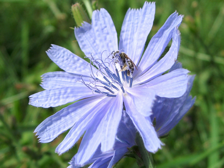 Mais revenons à la fleur. Chez la chicorée, le stigmate se sépare en deux parties et il est fermé au matin. La fleur est donc virtuellement mâle, le pollen est dispersé.