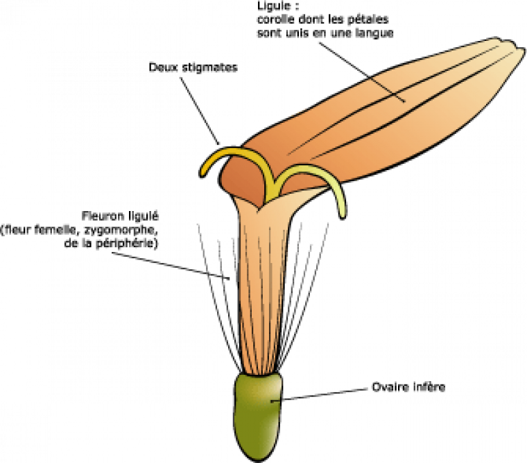 Les « pétales » bleus/violacés du pourtour qui lui donnent son aspect sont en fait les ligules de fleurs indépendantes.