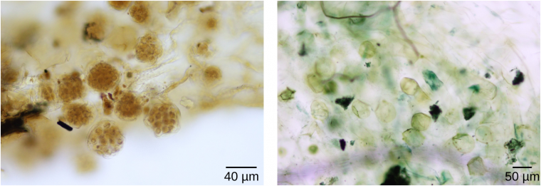 Gauche : anthéridies contenant encore des spermatozoïdes.
