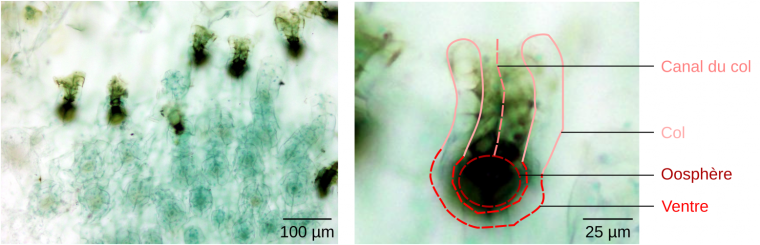 Les archégones sont produits au niveau de l’échancrure du cœur formé par le prothalle (Figure 10). Ils ont une structure plus complexe : une partie renflée (ventre) contient une oosphère (gamète femelle), tandis qu’une partie allongée (le col) dépasse du prothalle. Les oosphères sont sphériques, de grande taille et non libérées à maturité.