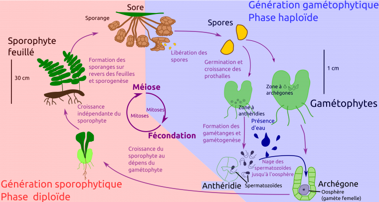 Cette alternance de deux générations est permise par les étapes fondamentales de la sexualité eucaryote que sont la méiose et la fécondation. Entre chacune de ces deux étapes, des mitoses permettent le développement de deux types d'individus : sporophyte (individu feuillé) et gamétophyte (prothalle).