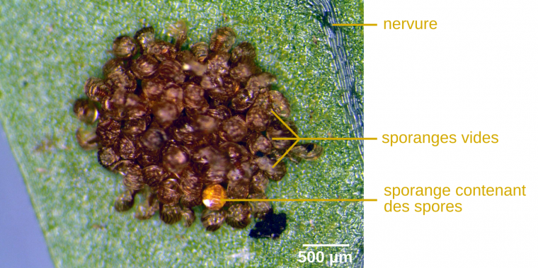 Le sore est granuleux car constitué par l’amas de nombreux sporanges. L’un des sporanges contient encore des spores de couleur jaune ; l’assise mécanique est bien visible. Noter également la présence d’une nervure, correspondant aux tissus vasculaires.
