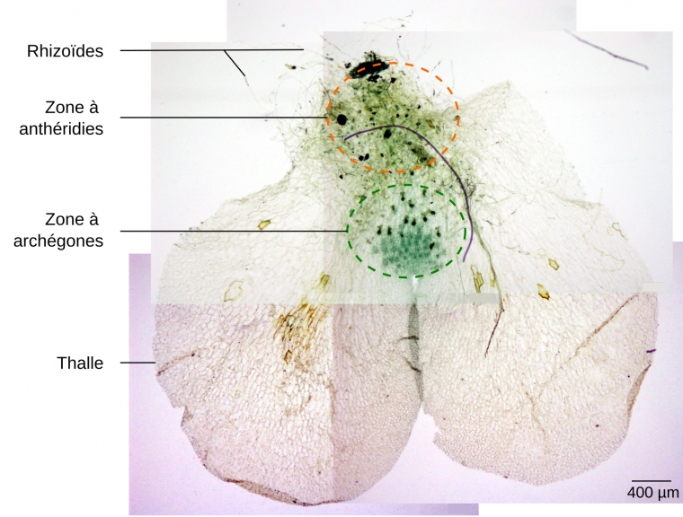 Droite : les anthéridies se sont déjà ouvertes et les spermatozoïdes ont été libérés.