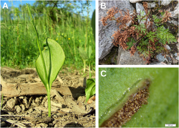 A. Eusporanges en épi d’ophioglosse (Ophioglossum vulgatum).