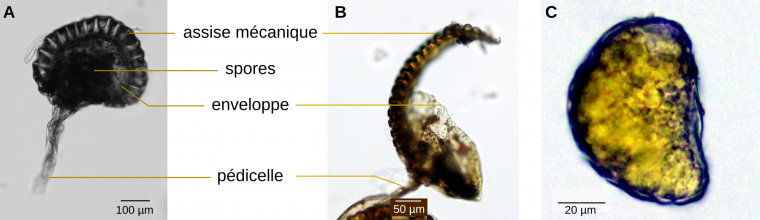 L’observation de sporanges au microscope optique permet de mieux en apprécier la structure (Figure 6). Chacun est constitué d’un filament (pédicelle) portant un petit sac terminal constitué de plusieurs cellules et produisant des spores. L’observation de coupes de sporanges à différents stades permet de démontrer que les spores sont produites à partir d’une cellule mère par quatre mitoses suivie d’une méiose, formant finalement 64 spores.