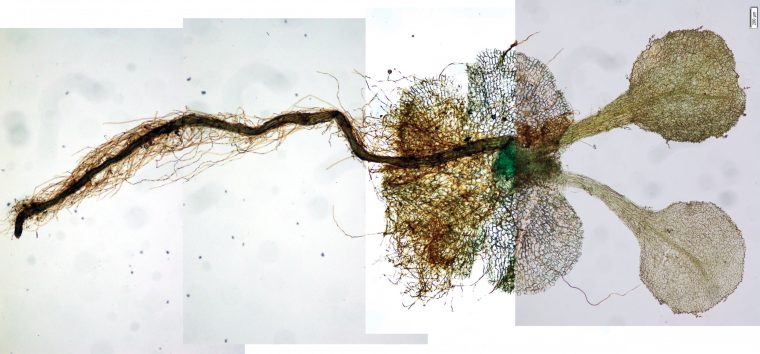 On distingue bien la racine en formation avec des poils absorbants, et deux feuilles avec des tissus vasculaires en différenciation. Mosaïque composée à partir de différents clichés en microscopie optique.