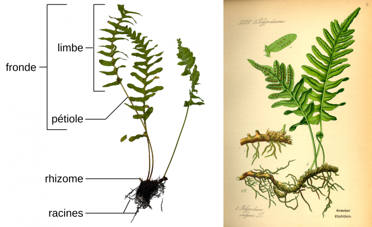 Les frondes sont produites par une tige rampante, parfois souterraine (un rhizome), de laquelle partent également des racines qui assurent la nutrition hydrominérale de la plante et son ancrage mécanique sur le substrat.